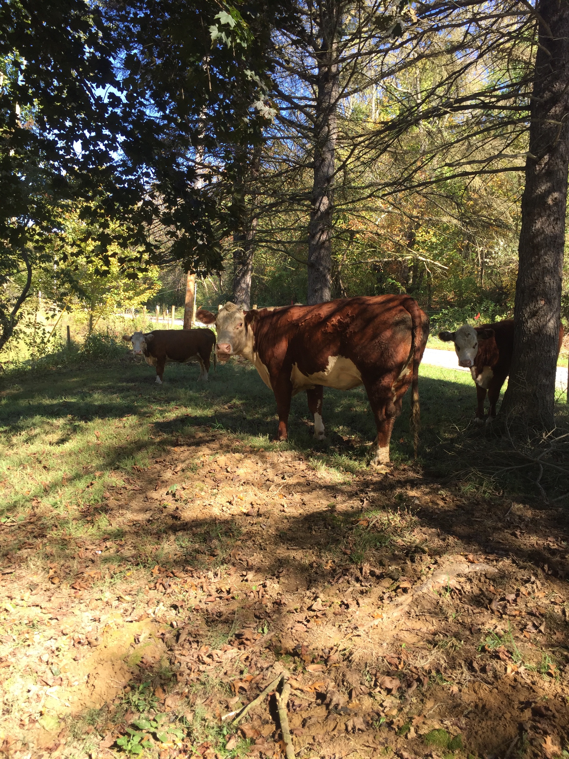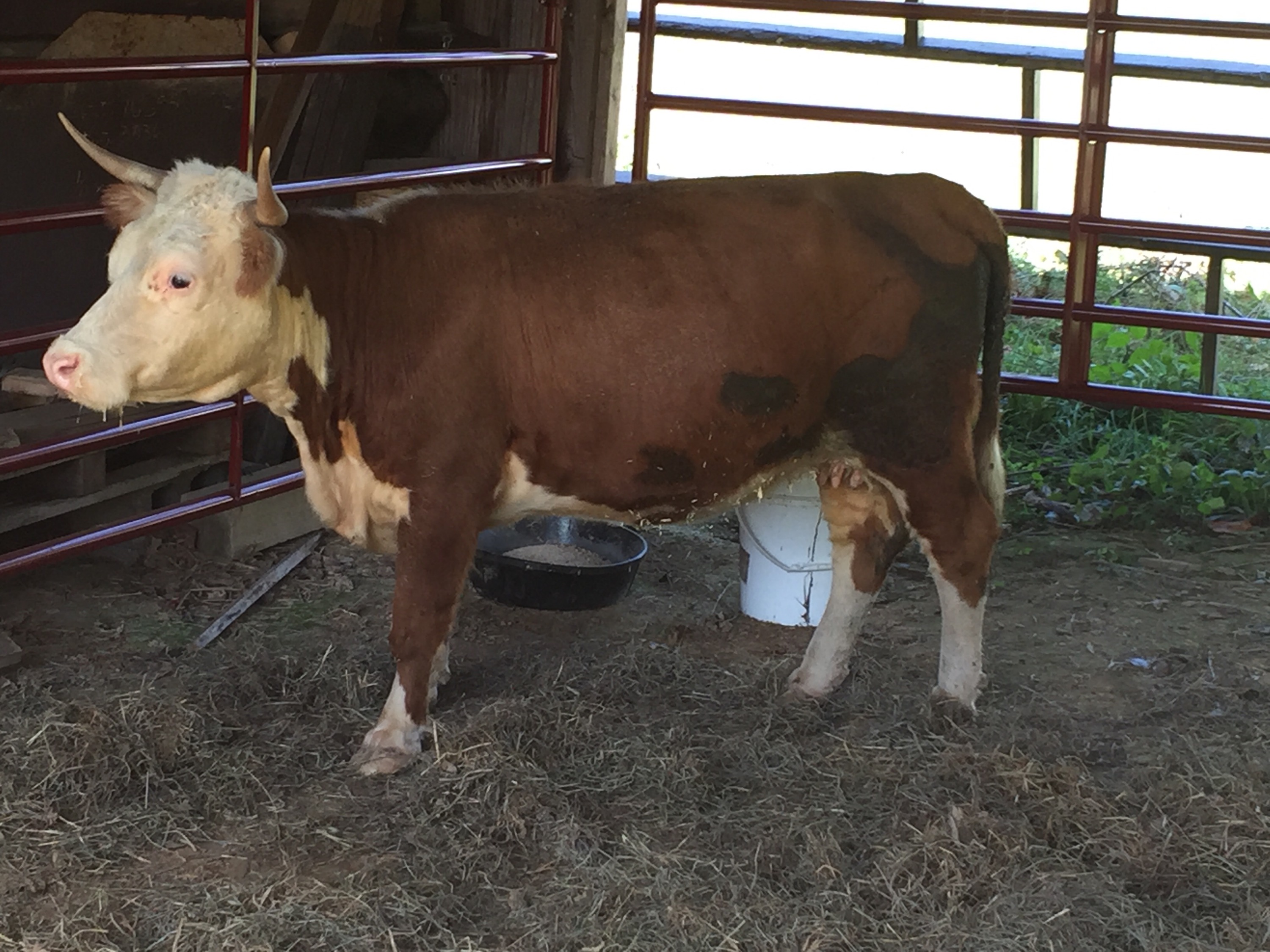 This weekend was extremely exciting for Angel Family Farms. After months of preparation, a hefty chunk of change and a LOT of help from some amazing people, our first cattle arrived on the farm! We bought two registered Herefords. One is a 4 year old cow (a female bovine that has already had a calf)named Jewel that is pregnant with a calf that is due in January or February. The other is a heifer (a female bovine that has not had a calf yet)named Schoolgirl that was born in April. We named her Schoolgirl because the house on the farm is an old one room schoolhouse. She won’t be bred for a while yet. Some cattle, like these two, are born polled, or naturally without horns. As long as those cattle are bred with a polled bull, they will have polled calves. We also got a third girl in the herd and she’s a little different.