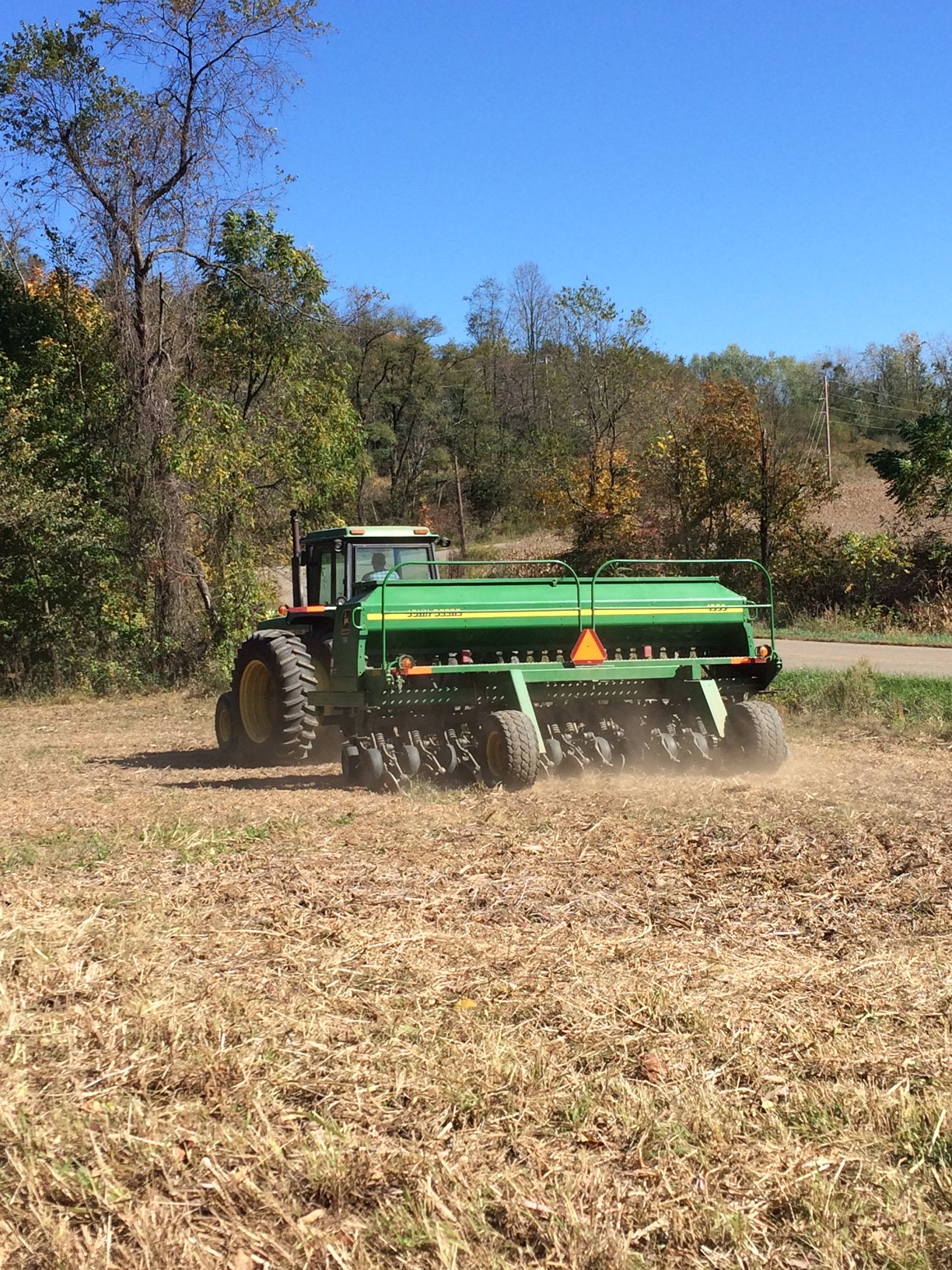 At our farm we try to harvest fields that are prone to erosion first. This allows us to utilize another tool in our no-till system, cover crops. Fields prone to erosion might include acres on a slope or acres along a creek or stream. Harvesting these acres first gives us ample time before colder weather to get a cover crop planted and growing. For us we plant winter rye. It is hardy and fast growing. Rye can grow just about anywhere and doesn’t require much finesse. It also competes well with weeds, choking them out in many cases. Now our bare soil is bare no more! Instead it goes into winter and the rainy spring season with a green cover on it. Cover crops have many other benefits other than erosion control. Remember we mentioned soil structure and health? When soil has nothing growing on it, life below the surface slows or stops all together. Tiny microbials need plant tissue and living roots to survive on. These microbials work to break down plant residue, building the soil. However this is a slow and tedious process. Having the cover crop alive in the soil over winter allows this process to continue. Also this activity in the soil allows earthworms to remain well fed and active. The worms move through the soil like tiny aerators opening pockets and channels for water and nutrients to be absorbed. The list of cover crop benefits goes on and on. For our farm we have only begun to scratch the surface with cover crops and we look forward to next summer when will plant tillage radishes as a cover after wheat. The tillage radish will grow a large tuber and tap root reaching several feet down in the soil. This will break up any hard pan and compaction in the soil without the use of mechanized tillage equipment. Stay tuned to hear more on that next year!