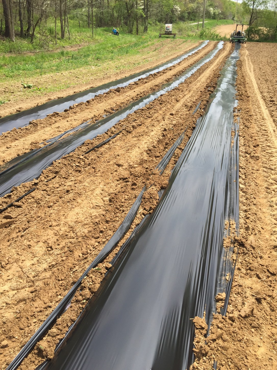 We have had a LOT of rain here lately, so it has been nearly impossible to get into the field to finish laying plastic. There is some hope for it to stay dry enough the next couple days that we could get it done though! All of our plastic will be recycled through a county Ag Plastics recycling program.