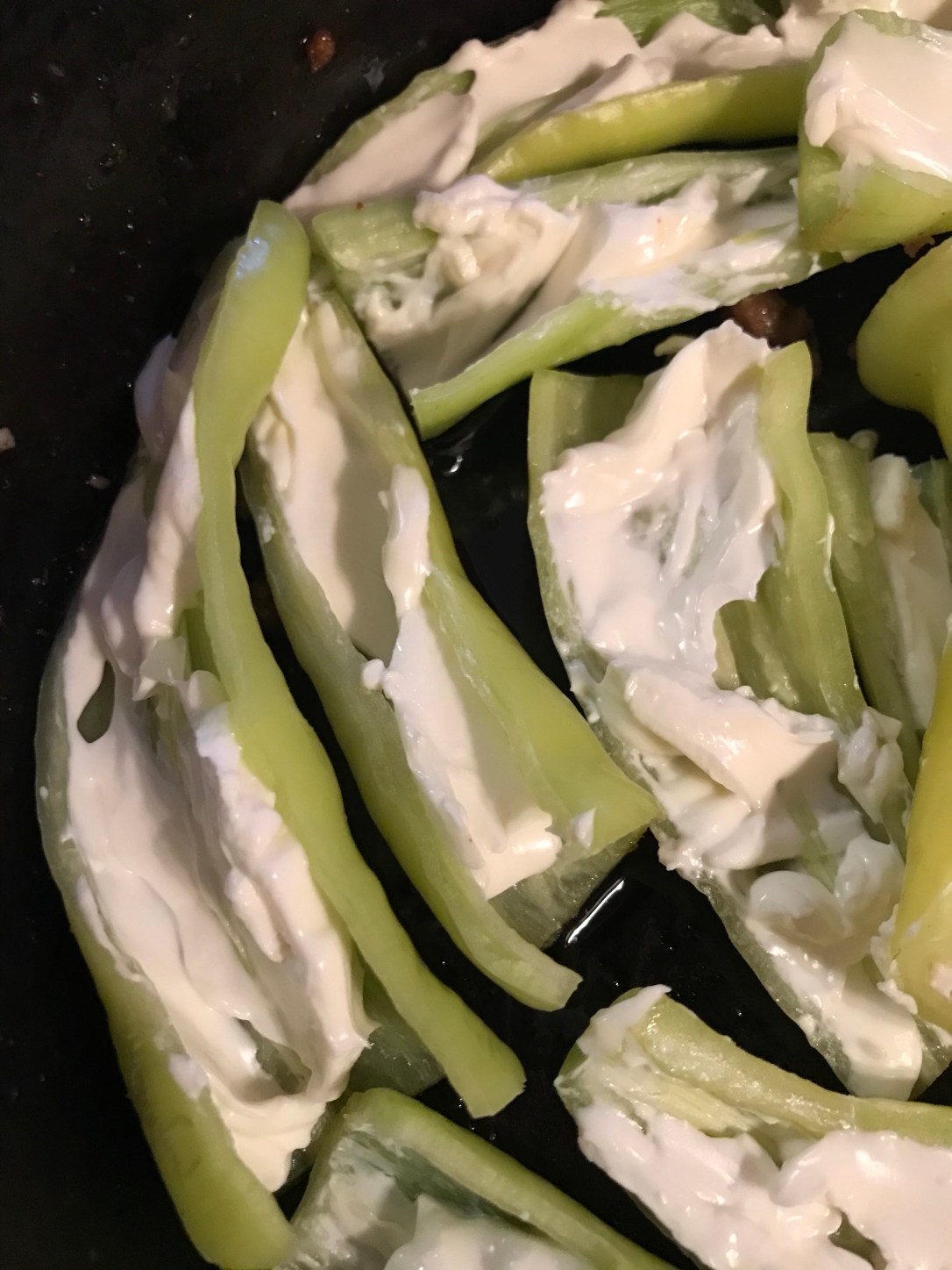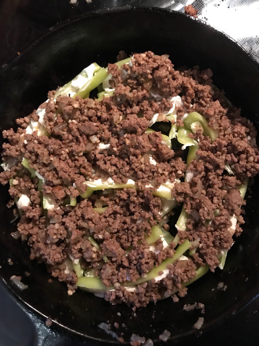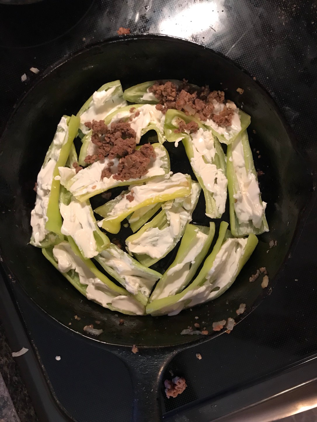 Step 4: Fill your pan/skillet. Line your cream cheese-filled peppers up in the pan so there is as little space as possible between peppers. Then cover the peppers with the meat. Now, sprinkle as much cheese as you want all over the top.
