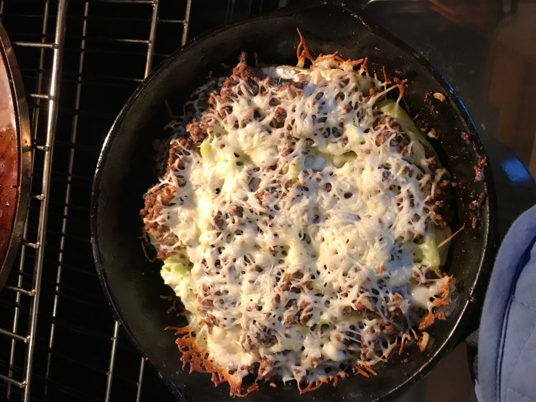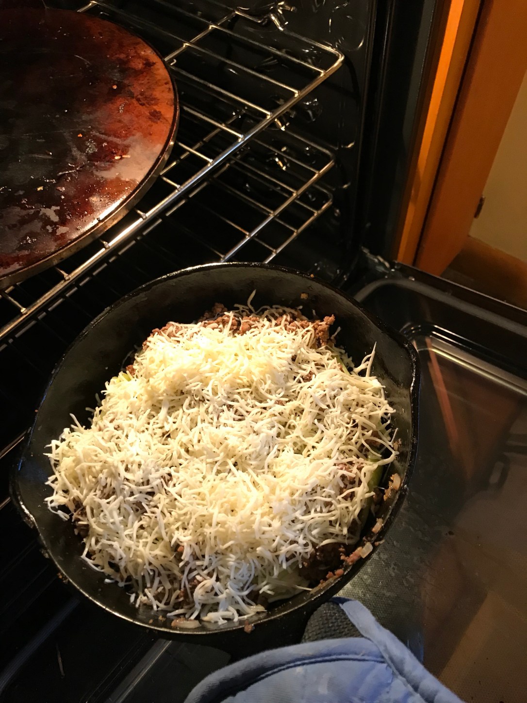 Step 2: Cook your meat. in a skillet (if you’re going to use a cast iron skillet you can do everything all in one pan. If you are using a glass baking dish in the oven, just use a regular skillet. Add your meat to the skillet. Then add the following: Garlic, chili powder, cayenne, cumin, dried cilantro, paprika, salt, and pepper (based on the picture below I also added some diced onions in this version). I don’t have measurements on these, but start by adding like 2TBSP of garlic and decrease down to around 1/2 tsp salt and pepper. Really its mostly what suits your taste the most. Cook the meat and spices until it is browned. Drain the meat and set it aside. If you are using a cast iron skillet leave a tiny bit of grease in the bottom. If not, put a little in your baking dish.