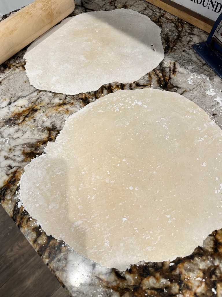 - On a counter dusted with flour or corn starch, roll out half the dough until very thin.
