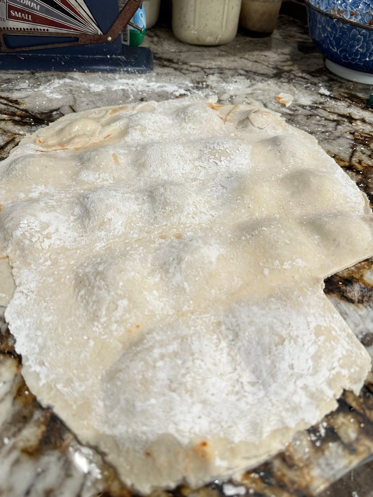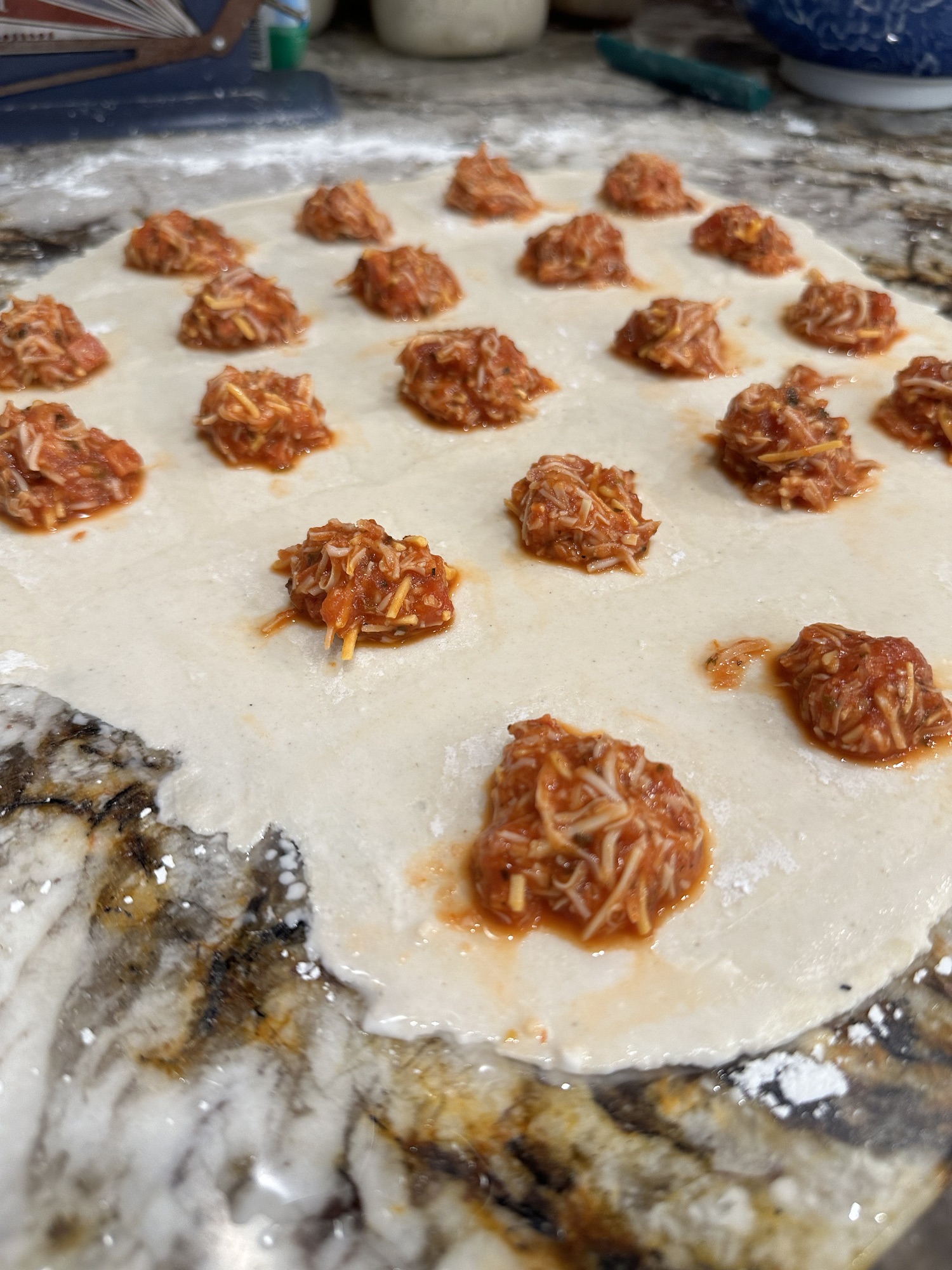 Roll out your dough and put little hills of filling all over the rolled out dough. This is the part where having a ravioli maker would be really handy.