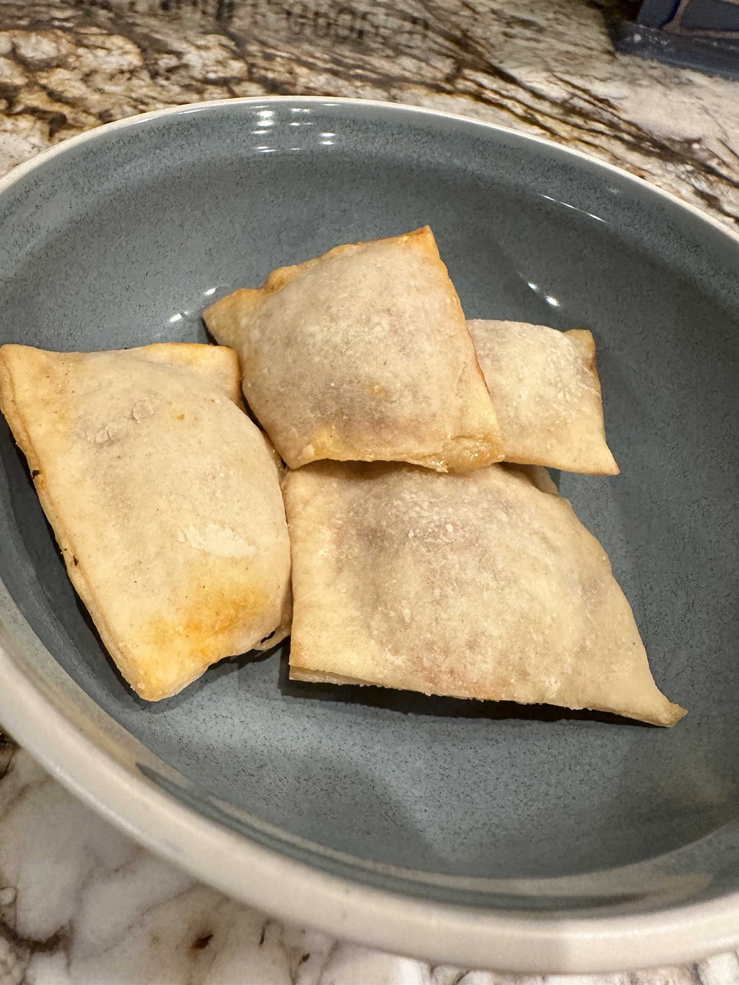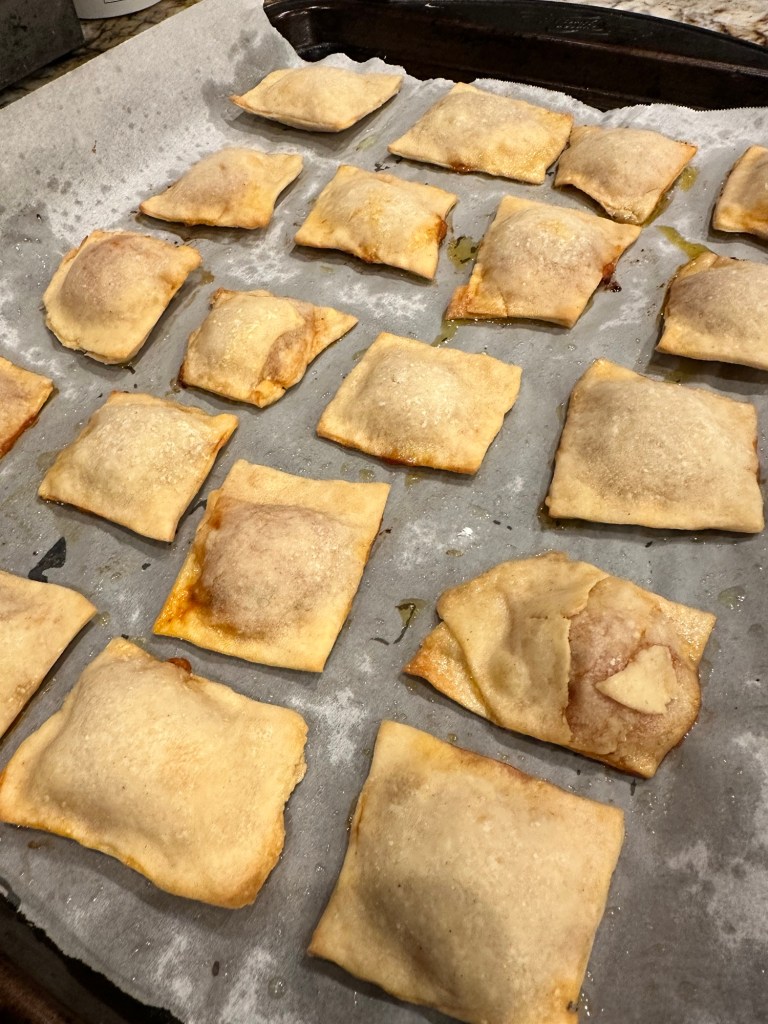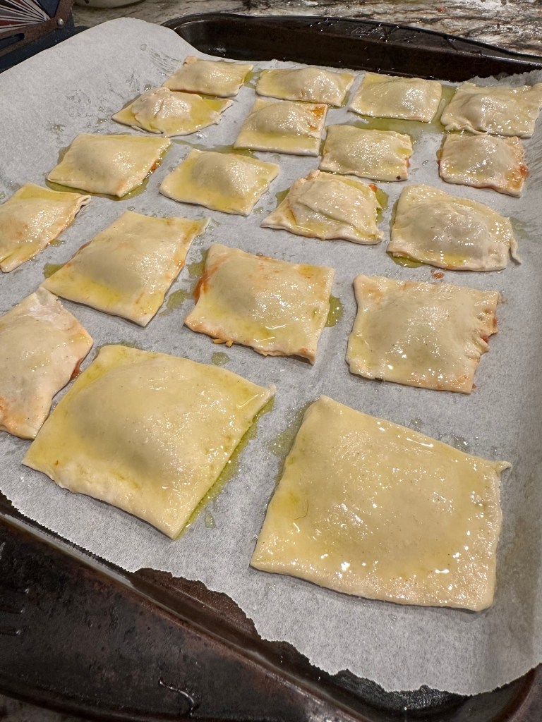 Cut out your pizza rolls and lay them out on a parchment paper covered baking sheet. Lightly brush them with Olive oil and pop them into the oven or air fryer until they’re golden brown. My food brush had some trauma… so it puts way too much olive oil on, ignore the excess and carry on as you were.